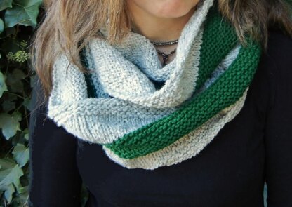 The scarf can be worked flat or in the round to form an infinity scarf/cowl. Instructions are given for both. A slight ruffle effect comes from drastically changing needle sizes for the center stripe.
