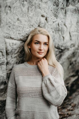 Yarn used in sample (size 2) is 4 skeins of Fivemoons Diana 4ply (50% silk, 50% Merino; 400 m / 100 g) in colourway Bone. It’s highly recommended to use sleek yarns with great drape as the mesh sections have a different stitch gauge and create bulging. It’s a welcomed design element but it can get exaggerated and lose elegance if using light and airy or woolly yarns.