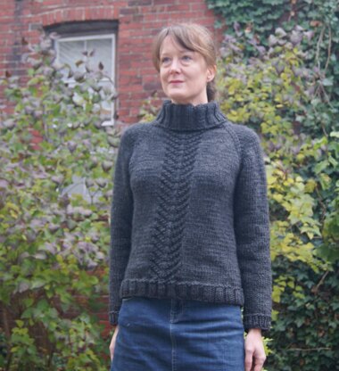Marram may be worn as a pullover with the buttons in the back or as a cardigan with the buttons in the front. It is knit seamlessly from the top down with raglan shaping, ribbed trims and a pretty knit and purl pattern down the center. The collar and buttonbands are picked up and worked in rib. Knit in lovely Puffin from Quince and Co., it works up very quickly.