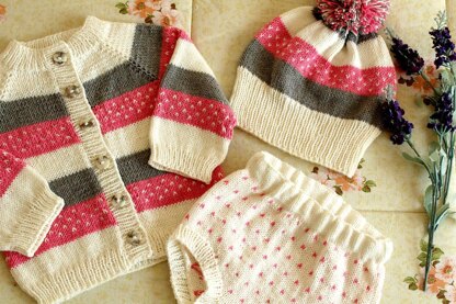 Marshmallow Baby Set consist of lovely hat, open cardigan and pair of bloomers. Hat and cardigan features stripes and polka dots and bloomers are designed only with cute polka dots, making this baby set just adorable for the little ones.