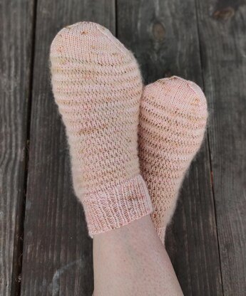 These are the lightest and fluffiest socks I have designed. Clocking just about 50 g of yarn, they are like a soft fluffy giant marshmallow. They are surprisingly stretchy, fun to make, and ultimately cozy on your feet.