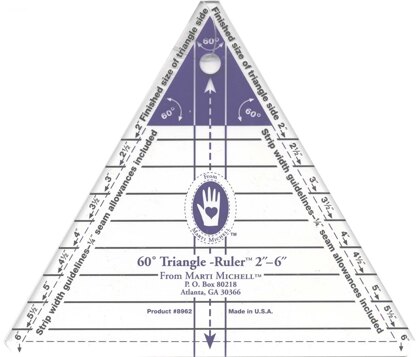 Mit unseren 60-Grad-Linealen mit mehreren Größen wird das Messen zum Kinderspiel. Sie lassen sich wunderbar mit den Schablonen aus unserer Sechseck-Reihe kombinieren (Sets G, H und N, Hexagon Ruler, Half-Hexagon Ruler, 60-degree Diamond Ruler). Andere Lineale in der Form von gleichseitigen Dreiecken messen die Höhe eines Dreiecks von der Mitte der unteren Seite bis zur Spitze. Unsere Lineale messen die Seite des Dreiecks. Tatsächlich orientiert sich die Größe aller Marti Michell-Produkte an der Länge der fertigen Seite, denn dieses ist das einzige Maß, dass alle Schablonen der Reihe gemeinsam haben.