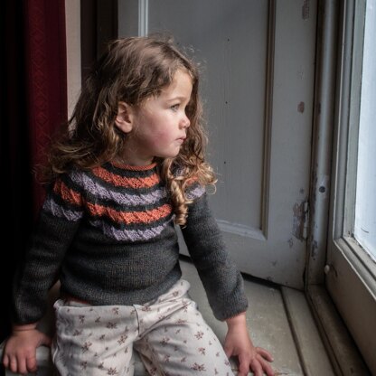 Marvina is a seamless colorwork sweater for children, worked in the round with a top-down construction. The yoke is knitted with a combination of plain stockinette stitch and coloured textured bands with an easy cable stitch pattern suitable for beginners.