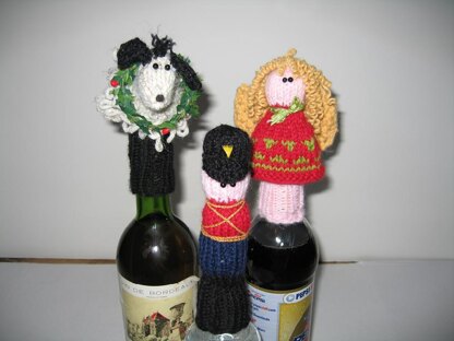 I had so much fun designing these bottle toppers. I guess I was in the Christmas Spirit. The knitting wasn't the only thing that was fun. Adding the details, like the feather on the soldiers hat got me excited too. I wanted to keep adding more and more to make them come alive. These characters will help you decorate any bottle...water, soda, or wine. They can even be used as finger puppets, or tie a bow on the bottom of them and hang them from the tree. Whatever you do, enjoy them.