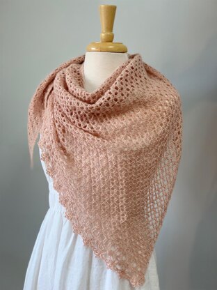Mary is a slightly asymmetric wrap. It begins with just a few stitches and gradually increases in length and width. It is finished along one side with a very feminine edging. There are three sections of different lace patterns. Mary begins with the most dense of the lace patterns and gradually becomes more lacy and open.