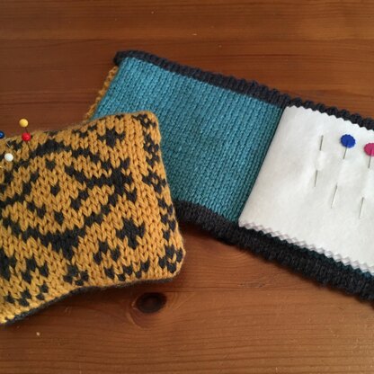 A bright matching pincushion and lined needle case using stranded knitting techniques. Named in honour of my mother who taught me to both knit and sew. The reversal of colours on the pincushion reflects the fact that she likes to change her mind!