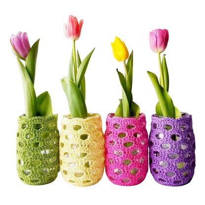 Crochet easy mason jar covers in spring colors. With this pattern you will learn to crochet honeycomb stitch. The cover fits standard 16oz mason jar. Fine cotton yarn is the best yarn choice for mason jar cover.