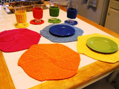Enough leftover cotton yarn inspired me to make coasters, placemats and cozies for beverage containers. It is a good project to use up your stash of left-overs! I used cotton, but acrylic is perfectly acceptable and even wool. If using wool yarn, remember it can not be tossed into the laundry "willy-nilly". It occurred to me as I wrote this description that placemats made in 100% wool yarn would felt beautifully and would make interesting placemats. Experiment, it's what I do.
