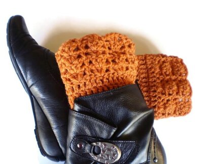 These crocheted boot cuffs would be suitable for a beginner who knows how to crochet chain , dc , treble . You need slightly more than 50 g of 8 ply yarn to make them . You could make a bigger or smaller size by changing your hook size or by adding or subtracting chains at the beginning . Measure around the widest part of your calf muscle for sizing . They are designed for calf high boots .