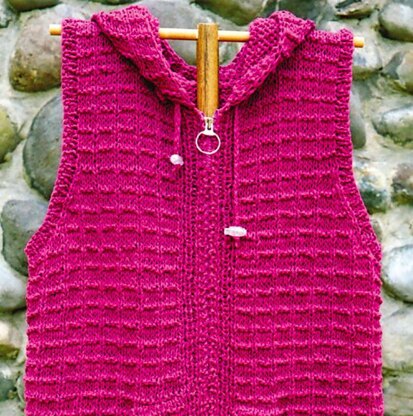Zippered vest featuring patch pockets and optional hood. Knit in worsted or chunky weight yarn.