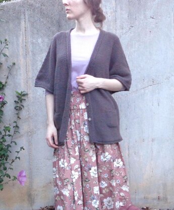 Knit in 3 pieces from the bottom up with sleeves worked at the same time as the body. Button band is picked up and worked after seaming.