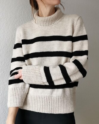 The MAXIME sweater is an oversized turtleneck sweater with wide sleeves and distinctive ribbed borders. The sweater is worked top-down.