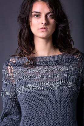 This sensual sweater is worked from the neck down in loose Stocking stitch throughout, incorporating contrasting yarns in textured bands around the yoke. The back piece is worked longer than the front piece to create a tab. The finished garment is very lightweight.
