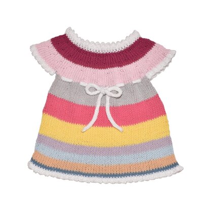 Maybelle is a cute and easy-to-knit dress, worked from the top down, with picots and an i-cord finish. With seven sizes, it’s the perfect way to use up color packs and leftover remnants.