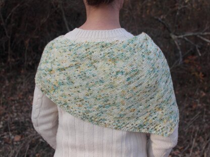 The shawl is worked starting at one point and working sideways. The fabric features streams of eyelets through the body and double eyelet rows on the two shorter edges.
