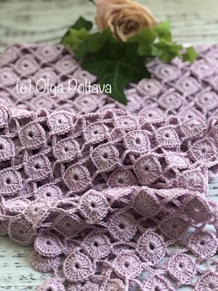 This is a pattern for a crochet shawl made with 100% mercerized cotton yarn, category 2, and a hook size D (3.25 MM) hook. The finished measurements are about 55 inches wide and 22 inches long (200 grams or 740 yards of yarn are needed for this size). The yarn I used in YarnArt Begonia.