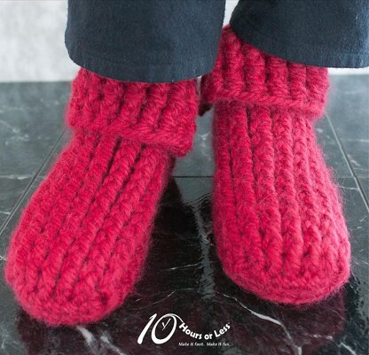Revisit Robin Hood with a plush and playful pair of boot-style slippers! Crocheted in one piece, these cuffed cozies feature a front panel of post stitches on a background of smooth single crochet. Sized for men, women and youth, the clever construction means there’s no sewing required. And best of all? These speedy slips can be made in either Super Bulky or Worsted weight yarn.