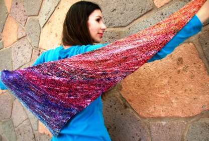 Simple garter stitch and stockinette stitch combine with sinuous short rows to give this asymmetrical triangle shawl its unique look. The colors flow through the hues of a beach sunset, giving you the fun of watching the yarn yield up its mysteries. Meditative knitting, along with a gorgeous gradient yarn, combine for a relaxing yet satisfying knitting experience. The shawl is knit to a looser gauge to create a soft cushy fabric that drapes nicely. It is worked from the narrow point to the wide end.