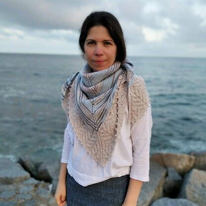 The Mediterranean Sunset Shawl is a triangular shawl worked in two shades of yarn. It will look more interesting if you chose variegated or speckled yarn as a contrast colour.