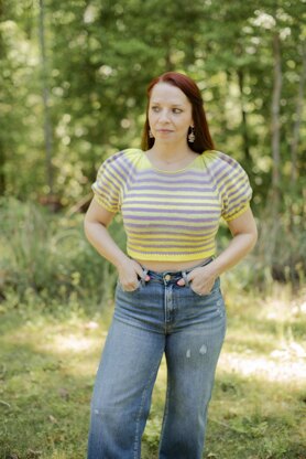 lStyled detail sets this top-down seamless pullover apart. Poofed sleeves & a keyhole neckline alongside adorable stripes make this top-down, seamless raglan-style knit both fun and unique. Choose a cropped or longer length sweater, short or long sleeves if you’d like, you can even sway out the poof sleeves with the classic shape from the Katy Lin cardigan, as these two sweaters were constructed with interchangeable options. Optional waist shaping is also provided for both lengths & a series of linked tutorials make this design extra accessible. Fifteen sizes are provided in this design so that you can get an excellent fit. Sweater is shown in Size 3 fitted with negative ease at the chest; model’s chest is 1”/2.5 cm larger than finished garment.