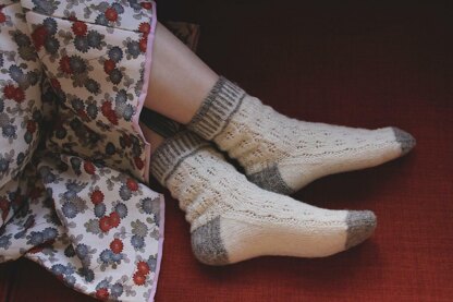Sachiko Burgin’s Meerschaum socks combine rustic yarn and delicate lace, creating a pair of dreamy socks. The socks are knitted in the round from the cuff down. Beautiful lace sections run down the ankles and feet. The pattern is written for DPN’s but it can be easily adapted to the magic loop method.