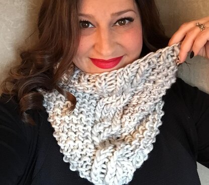 Mega Cozy Cowl has a lovely cable running up one side with all around seed stitch.