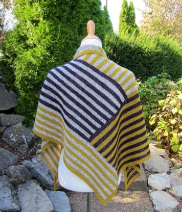 Like Derecho, Meg's Wrap is made with three colors of yarn--a light color, a medium color, and a dark color. My hanks of Isager Spinni contain 330 yds per hank. So, I had to purchase 2 of each color to complete the wrap. Based on the yarn I had remaining, here are my estimates of yarn needed: Dark-400-430 yds, Light-400-430 yds, and Medium 530-570 yds (Medium is the gold color in my wrap).