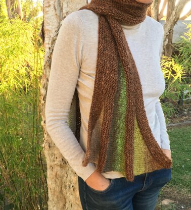 It takes 3 balls of Noro Silk Garden Solo and 1 ball of Noro Silk Garden. This blend of silk, mohair and wool gives the scarf a luxurious feel and slight sheen.