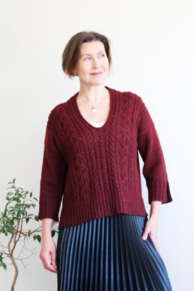 Yarn: The sweater is worked by holding one strand of fingering-weight yarn together with one strand of lace weight yarn.