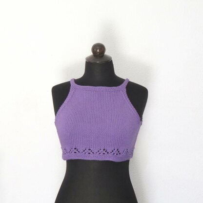 This summer crop top is made with cotton yarn in a powerful purple color. It has a halter neck with a button that closes in the back and simple eyelet details. It is worked from bottom to top in circular needles until underarm and then front and back pieces are worked separately.