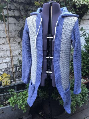 This crochet pattern is for a men's Shrug. The pattern includes an optional hood. The garment is designed to be open at the front. It also includes two large pockets. The pattern was designed using DK acrylics, so the shrug is warm and cosy. The garment is made in five pieces and then sewn together.