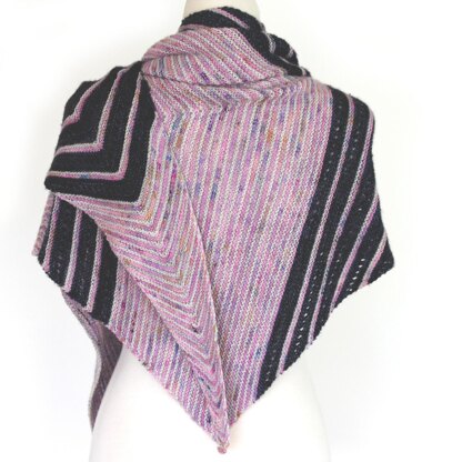 Eye-popping neons, speckled hand-dyes, elegant neutrals... Merinda is an opportunity to let your colour style shine. Written for three colours, it is easily adapted to suit any combination. Plus, Merinda's rhythmic increases pair with asymmetrical triangular shaping to create a shawl that is terrific to knit and easy to wear. Sublime!