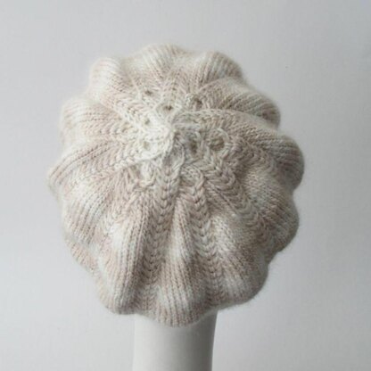 This hat knits from the bottom up. This full beret style hat reminds me of a meringue cookie with the puffed out sides and the swirl of pattern at the top.