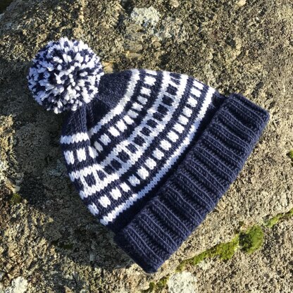 The hat rim is knitted in double rib stitch. Due to the hat being knitted in the round, the easy colourwork and shaping sections are knitted in knit stitch but produce a stocking stitch result. Instructions for the stranded colourwork are provided in both written and chart form.