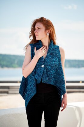 Notes: The vest wrap is knitted sideways in one rectangular piece with shaped armholes. To make the vest longer, add pattern repeats of 6 stitches at left side of work (end of RS row) before the border stitches.