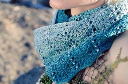 An easy lace-stitch cowl knit in the round with optional beads. The cowl is long enough to wear loose as a scarf, or wrapped twice around the neck for a more snug fit. It features an undulating lace wave pattern.