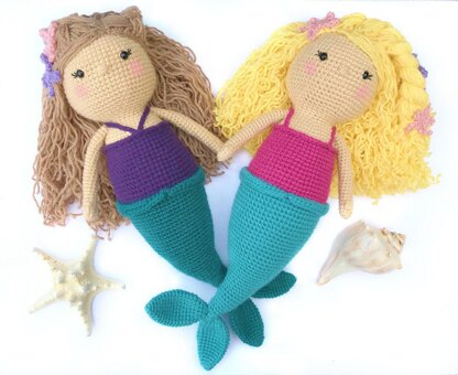 Crochet a mermaid for someone special and you'll be giving a handmade doll to love and cherish for years to come. The mermaids pictured here were designed with my daughters in mind. With their sweet expressions, rounder tummies, and tankini-style swimsuits, I wanted to give them a look fitting my young girls. They are larger dolls (about 18" from the top of the head to the tips of the tail) - perfect for playing with and cuddling. You'll need the yarn colors pictured (worsted weight), a size E crochet hook, safety eyes, a yarn needle, stuffing, and an intermediate crochet skill level. The finished dolls are about 18" tall. Your PDF purchase includes instructions for both styles of mermaid dolls pictured here.