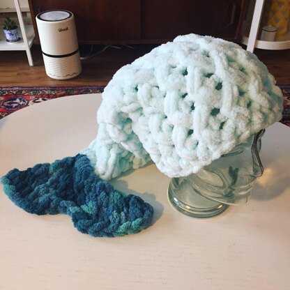 THIS IS A LOOP YARN FINGER KNITTING PATTERN. The Mermaid Tail Hat is a novelty pattern of fish-scale stitches for the body of the hat finishing in a tail fin at the end. This pattern yields a hat of suitable size for a 3-8 year old, or a 'baby bag' mermaid tail for baby photos (0-3 month size).
