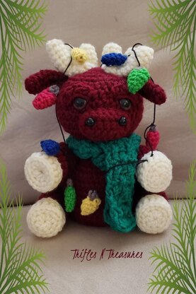 It's never too early to have a Merry ChrisMoose, is it? This poor guy could use a little help putting up his lights...I guess it's kind of tough not to have fingers! He's huggable, when created in yarn, and measures 7" tall, while he's sitting down...Create him in thread, for an adorable 3" collectible He can even pass for a reindeer! Very customizable... The pattern for the basic moose/reindeer can be found in my book, but without the lights and scarf!