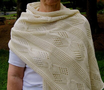 This is a pattern for a light weight wrap. It's heavier than a shawl, but just the ideal weight for a spring or fall evening, or even if you're sensitive to air conditioning in the summer. It knits up fairly quickly and would make the ideal gift, for yourself of someone that's special to you. It is made up of a cable lace stitch combined with an unusual mesh stitch that shows off the cable-lace perfectly. The final size is 24 inches by 72 inches.. There are also instructions for an optional edging contained within the pattern, should you want it edged. Skill Level: Intermediate (assuming a basic knowledge of lace knitting) The yarn used in the sample is Lorna's Laces Shepherd Sport . It was expertly pattern tested by: Cherie Warner, who can be contacted at: bwarnergroup@ wowway.com