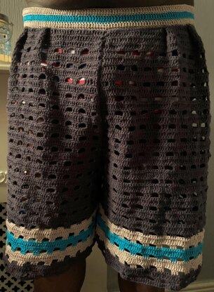 This crochet pattern is for a pair of men's shorts, made with 4 ply cotton in a mesh design. It uses an alternating dc / sc row combination to add stability to the mesh. While the item will be see through, it is not too daring and would suit a day at the beach, covering swimwear.