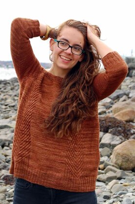 A seamed, drapey, oversized sweater with asymmetrical cable panels. Sample is 46", shown on a 38" bust for 8" of positive ease. Length is easily customizable.