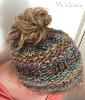 Worked in the round in a super bulky weight, this special beanie will work up so fast! There is a hole left at the top for a ponytail or messy bun, so no more hat hair! You can be warm, and keep your hair out of your eyes.