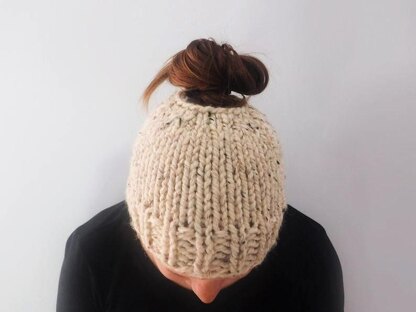 Our trendy messy bun hat is a winter accessory must-have. Available in the following sizes: 1-3 Years, 4-12 Years, Women The hat is made with Lion Brand Wool Ease Thick & Quick yarn. It looks wonderful in both neutrals or brighter colors available in this yarn.