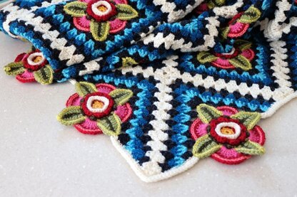 This design features a repeated diamond pattern which echoes those found on rugs and wraps from Mexico. A flower motif sits at the centre of the diamond motif and Jane has used surface slip stitch to enhance the idea of hand stitching. The flowers sit on the edge of the blanket to give it a really unusual border.