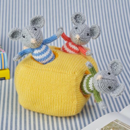 These sweet little mice (Hickory, Dickory and Dock) love to play hide-and-seek on a big chunk of cheese. Designed by Amanda Berry @fluffandfuzz, the toys are knitted in acrylic DK yarns. Most pieces are worked on single pointed needles (not in the round). Use two DPNS to knit i- cord tubes for the arms, feet and tails. For confident beginners and above, other techniques used include casting on and off, knits, purls, increases and decreases, knitting stripes, knitting i-cord, and seaming to finish. The cheese block is 13cm x 9cm x 10cm, and each mouse is 10cm tall.