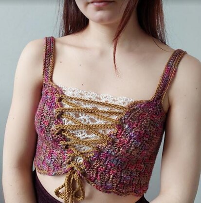 This pattern gives you many options to decorate it and make it a piece of art. You can wear it with lacing underneath – that can be put away. You can wear it over blouses as a vest or as is. Wear it 2 ways with lacing in the front or in the back.