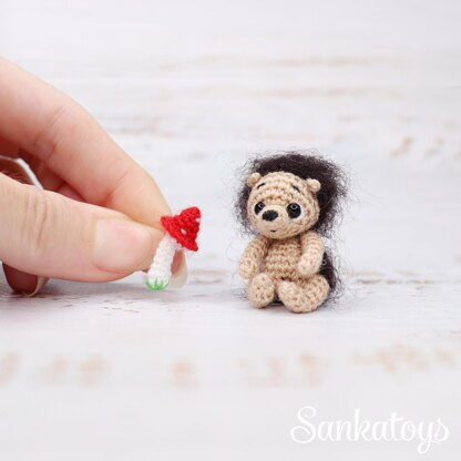 Yarn: I use thin «Slonim» yarn (cotton+acrylic, 100g ~ 1500m). Colors: beige for hedgehog; red, white, green to crochet a mushroom. A floss of 1-2 threads is also suitable, you need a thin thread, as thin as possible. For skin (needles) I use Camelot Lineapiu yarn dark brown color (mohair, 100g ~ 1000m), you can use Alize Kid royal mohair or other analogues.
