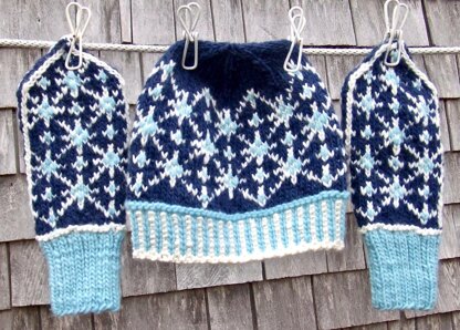 About The Design: After I designed the ‘Midnight Snowfall Tea Cozy’, I just had to use the color pattern as the main pattern for a set of hats and mittens. To make the mittens more interesting to knit and wear, I designed them in the Norwegian style, with a smaller palm pattern, striped thumb gussets and thumbs, demarcating side stripes, and angled shaping at the tips. The pattern offers a child’s medium and a woman’s medium hat and mittens, knit in widely available Lamb’s Pride Worsted and Lanaloft Worsted. Full-size mitten charts make it easier to follow. Knit a set for someone you love this winter!