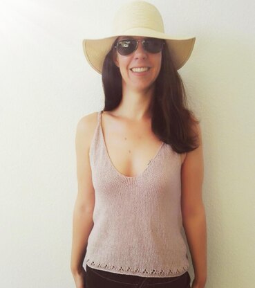 This Midsummer top has a double V and is knitted top down. Due to this you have the advantage to choose your desired length. Each front will be knitted separately and then both will be joined, the same for the back. After joining all parts you are knitting in rounds until your desired length. At the hem there is an easy lace part. The straps have a pattern of some single cables which gives more stability and an appearance of chained straps. In this pattern I will show you how you can construct this top on a needle without putting parts on waste yarn. Additionally a photo tutorial is given to knit cables without an additional needle.